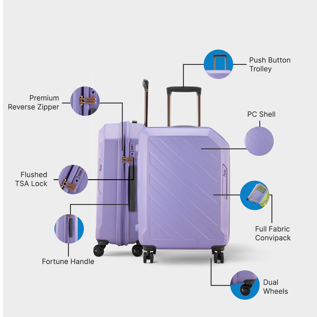 Like elegant brushstrokes on a painting, this luggage masterpiece will inspire you to go places & Chase The World! This strong polycarbonate shell design with organised interior, smooth dual wheels, flushed TSA lock, Reverse zipper, wet pouch for toiletries, push button trolley & the ever so visually delightful design, will ensure your bag gets a 2nd look.