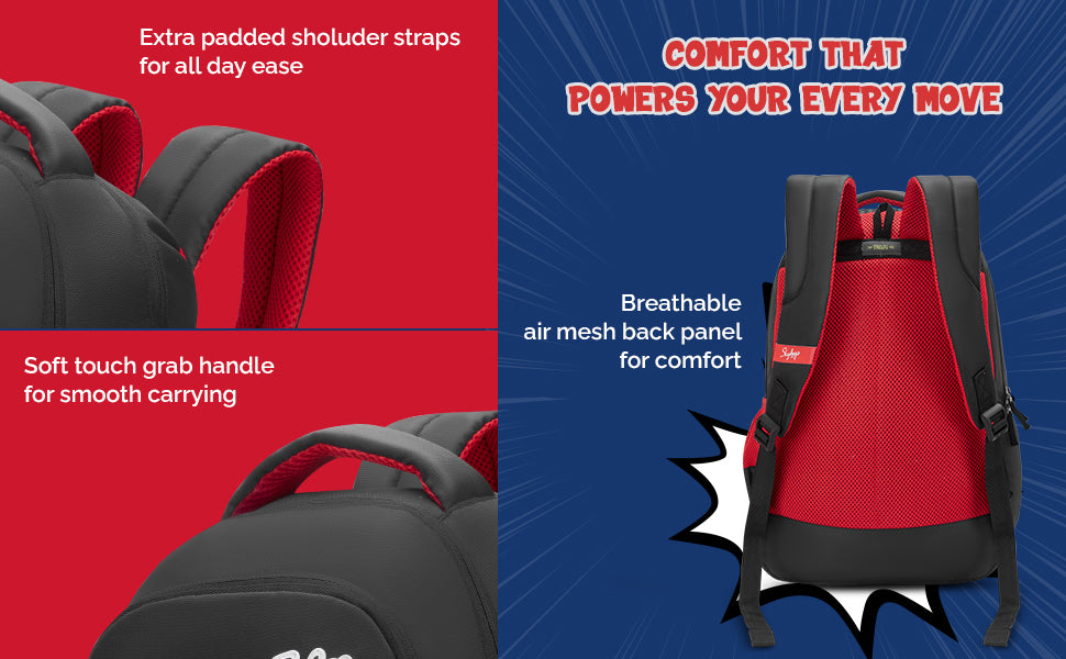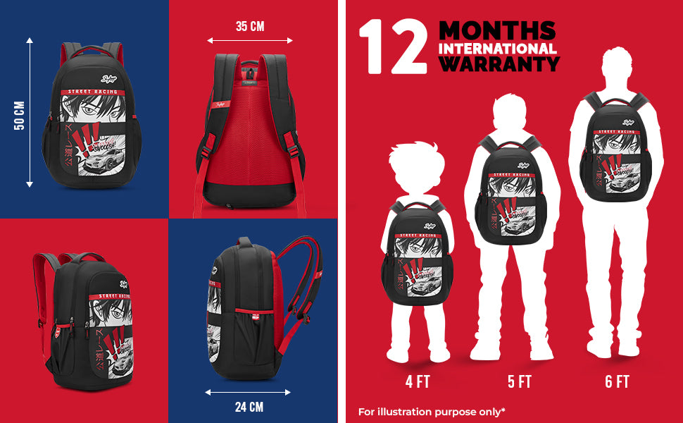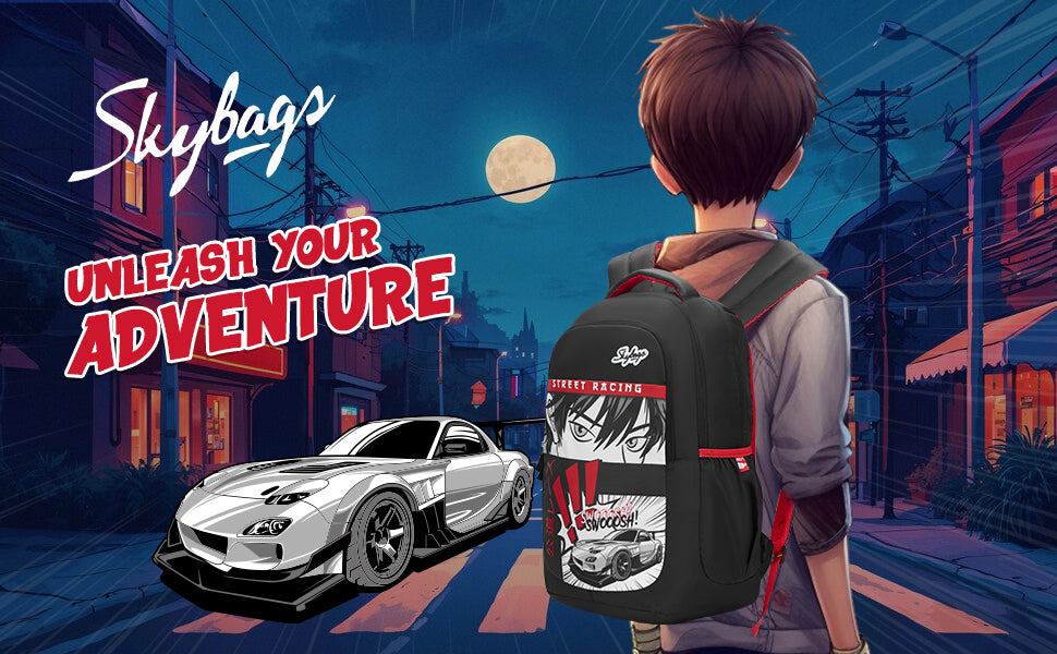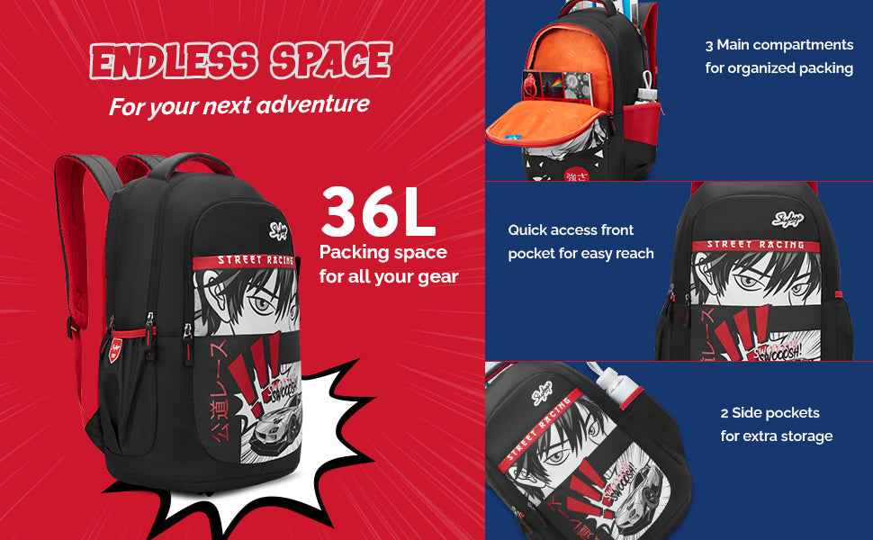 Skybags Kyro RC Anime, Polyester, 36 Liters, 3 Compartments, Raincover, 2 Side Bottle Pockets, Built To Last Straps, Swoosh Black For Boys And Girls